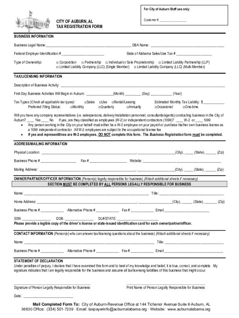For City of Auburn Staff use only: Customer # CITY OF AUBURN, AL TAX REGISTRATION FORM BUSINESS INFORMATIONBusiness Legal Name: DBA Name: Federal Employer Identification # Type of Ownership:State