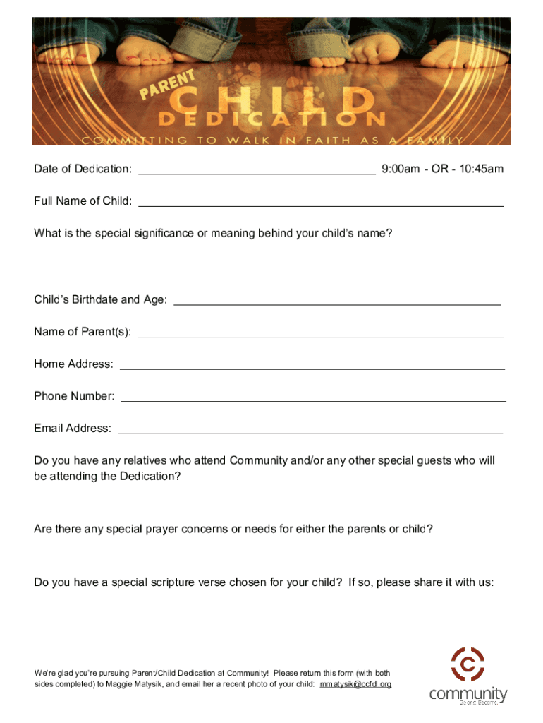 NT E R Palate of Dedication: 9:00am OR 10:45am Full Name of Child: What is the special significance or meaning behind your children name? Child's Birthdate and Age: Name of Parent(s): Home Address: