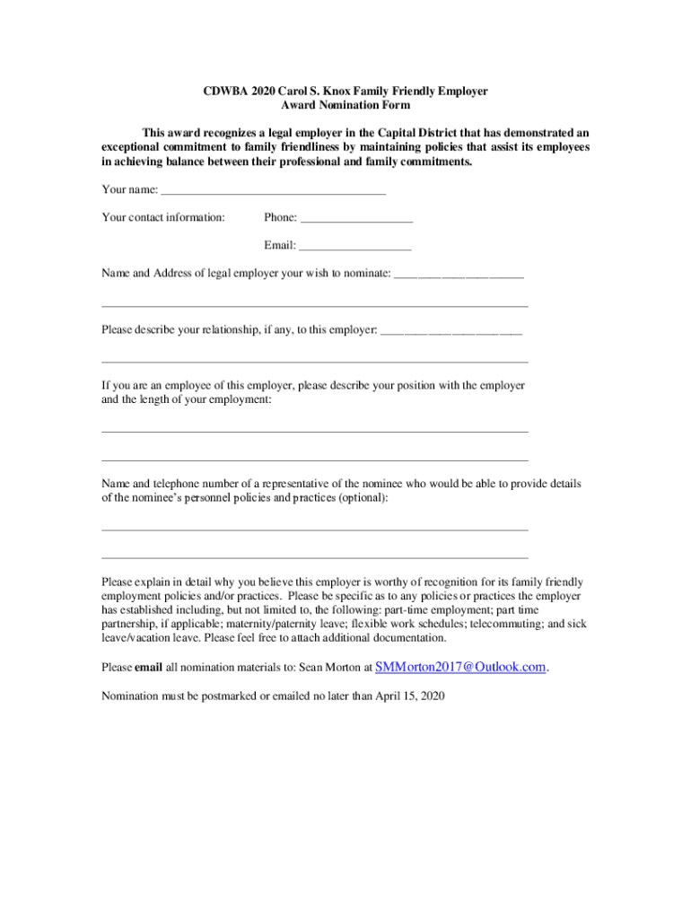 CD WBA 2020 Carol S. Knox Family Friendly Employer Award Nomination Form This award recognizes a legal employer in the Capital District that has demonstrated an exceptional commitment to family friendliness