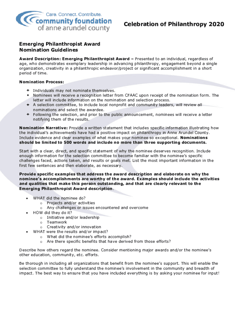 Celebration of Philanthropy 2020 Emerging Philanthropist Award Nomination Guidelines Award Description: Emerging Philanthropist Award Presented to an individual, regardless of age, who demonstrates