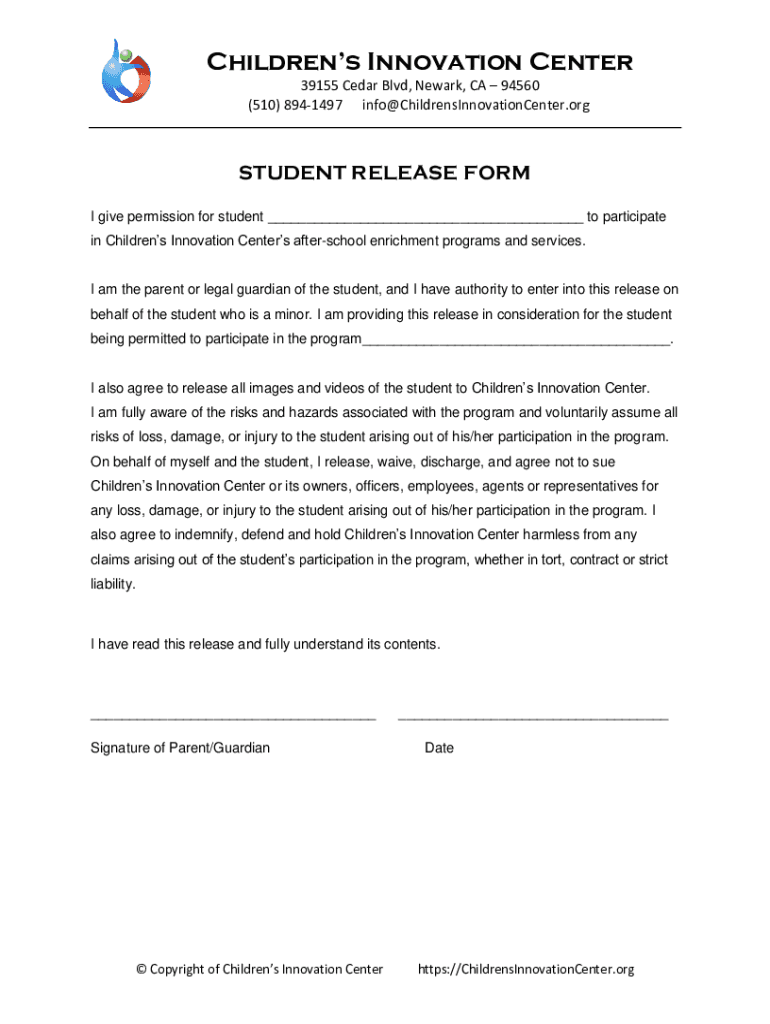 Children's Innovation Center 39155 Cedar Blvd, Newark, CA 94560 (510) 8941497 info ChildrensInnovationCenter. Student RELEASE FORM I give permission for student to participate in Children's Innovation