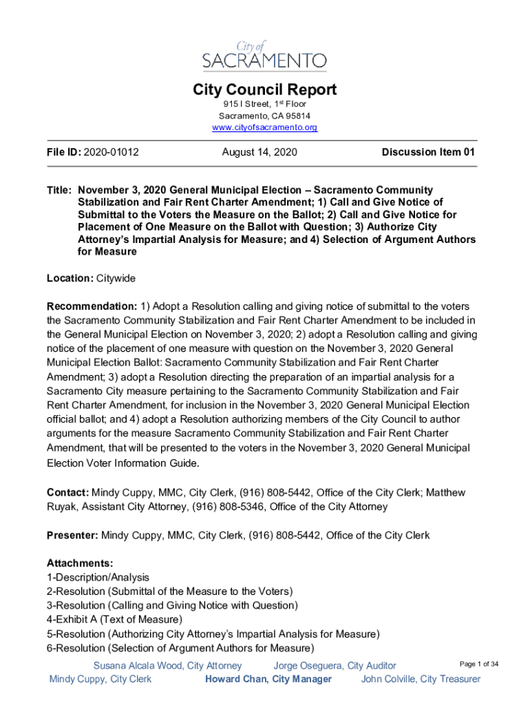 City Council Report 915 I Street, 1st Floor Sacramento, CA 95814 www.cityofsacramento.orgFile ID: 202001012August 14, 2020Discussion Item 01Title: November 3, 2020, General Municipal Election Sacramento