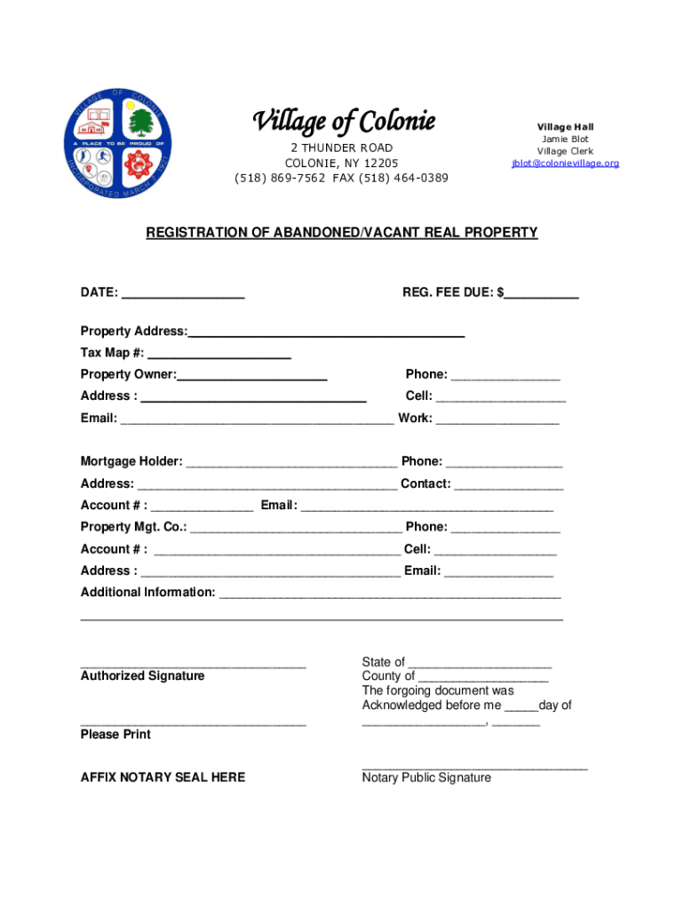 Village of Colonies 2 THUNDER ROAD COLONIES, NY 12205 (518) 8697562 FAX (518) 4640389Village Hall Jamie Blot Village Clerk blot colonievillage. Preregistration OF ABANDONED/VACANT REAL PROPERTYDATE: