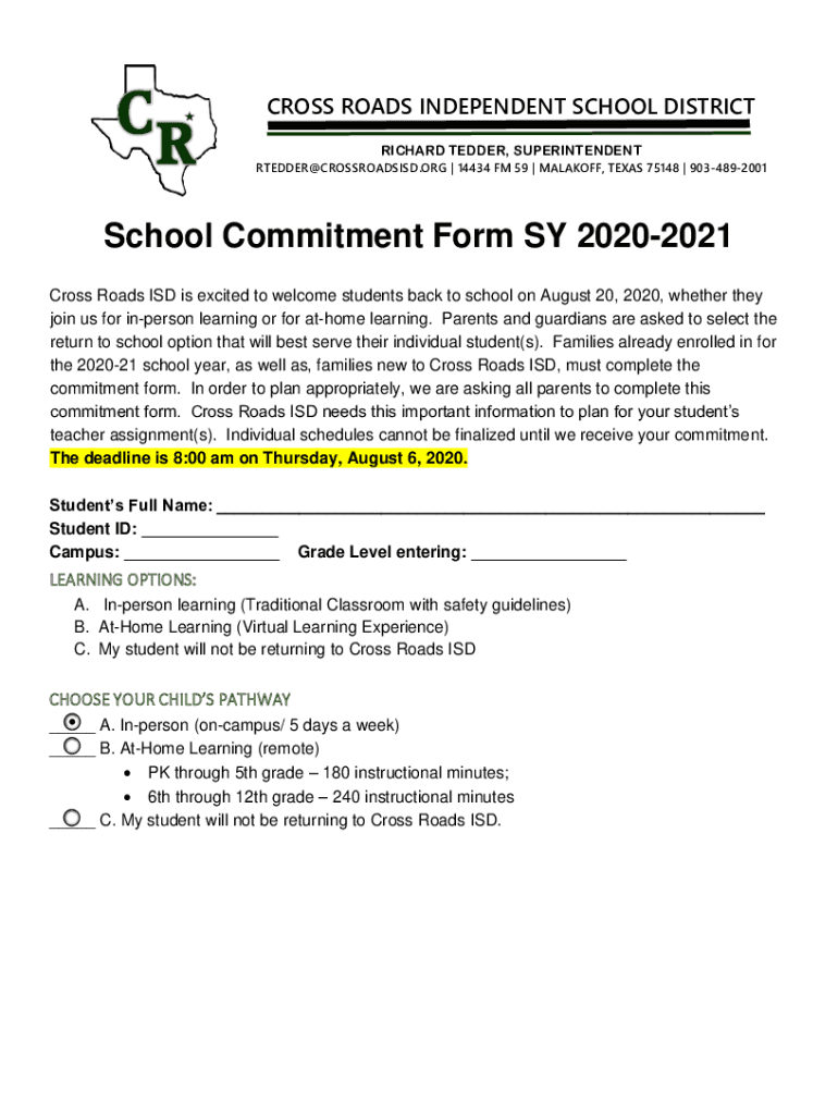 CROSS ROADS INDEPENDENT SCHOOL DISTRICT RICHARD TENDER, SUPERINTENDENT REDDER CROSSROADS ISD.ORG 14434FM59 PLAYOFF,TEXAS75148 9034892001 SchoolCommitmentFormSY20202021 Pleasecompletethisform, saveittoyourcomputer/device,