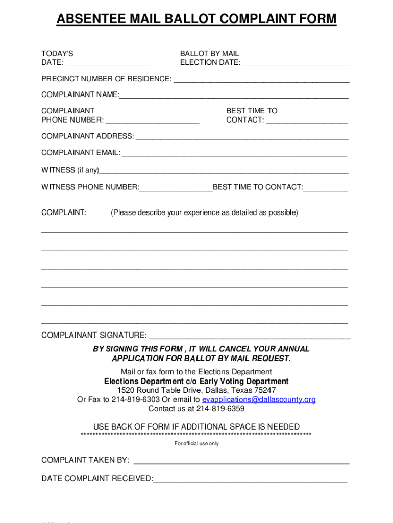 Get the free ABSENTEE MAIL BALLOT COMPLAINT FORM ... - dallascountyvotes.org