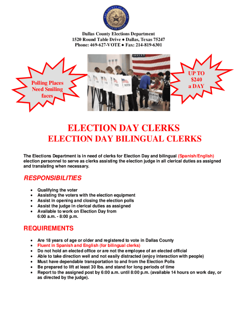Dallas County Elections Department 1520 Round Table Drive Dallas, Texas 75247 Phone: 469627VOTE Fax: 2148196301UP TO $240 a Patrolling Places Need Smiling deselection DAY CLERKS ELECTION DAY BILINGUAL