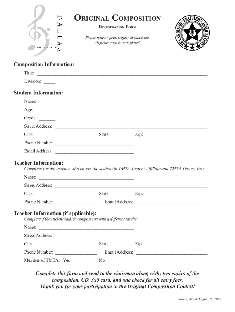 Original Composition Registration Form Please type or print legibly in black ink. All fields must be completed. Composition Information: Title: Division: Student Information: Name: Age: Grade: Street