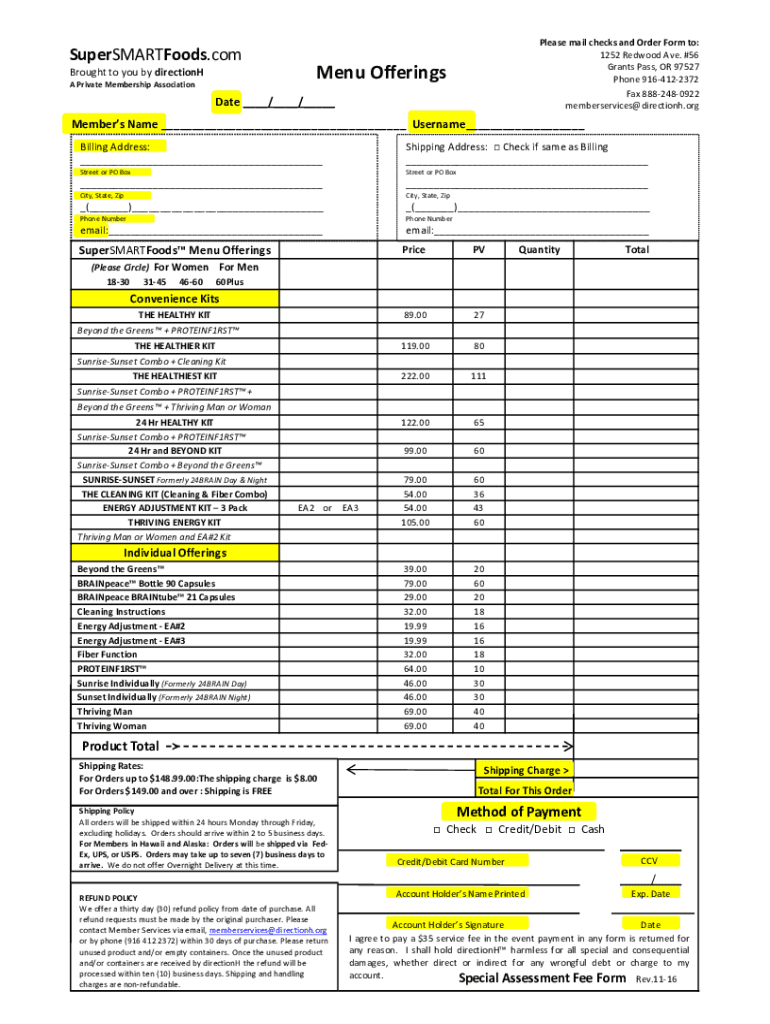 SuperSMARTFoods.com Brought to you by direction A Private Membership AssociationPlease mail checks and Order Form to: 1252 Redwood Ave. #56 Grants Pass, OR 97527 Phone 9164122372 Fax 8882480922 member