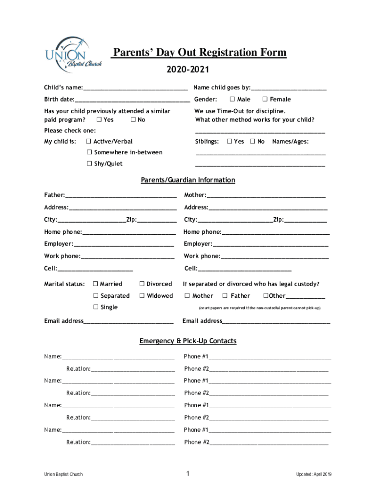 Get the free Parents Day Out Registration Form - Union Baptist Church