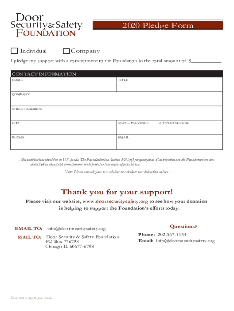 2020 Pledge Form Individual Company pledge my support with a commitment to the Foundation in the total amount of $ CONTACT INFORMATION NAMETITLECOMPANYSTREET ADDRESSCITYSTATE/PROVINCEPHONEEMAILZIP/POSTAL