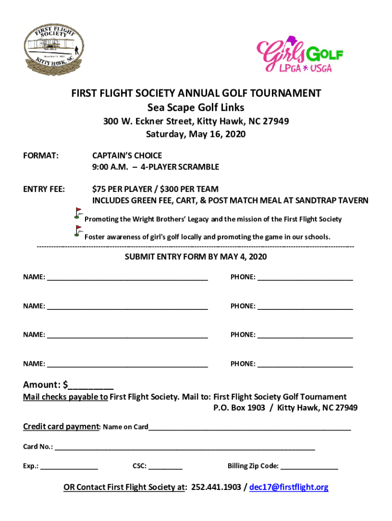 FIRST FLIGHT SOCIETY ANNUAL GOLF TOURNAMENT Sea Scale Golf Links 300 W. Becker Street, Kitty Hawk, NC 27949 Saturday, May 16, 2020FORMAT:CAPTAINS CHOICE 9:00 A.M. 4PLAYER SCRAMBLEENTRY FEE:$75 PER