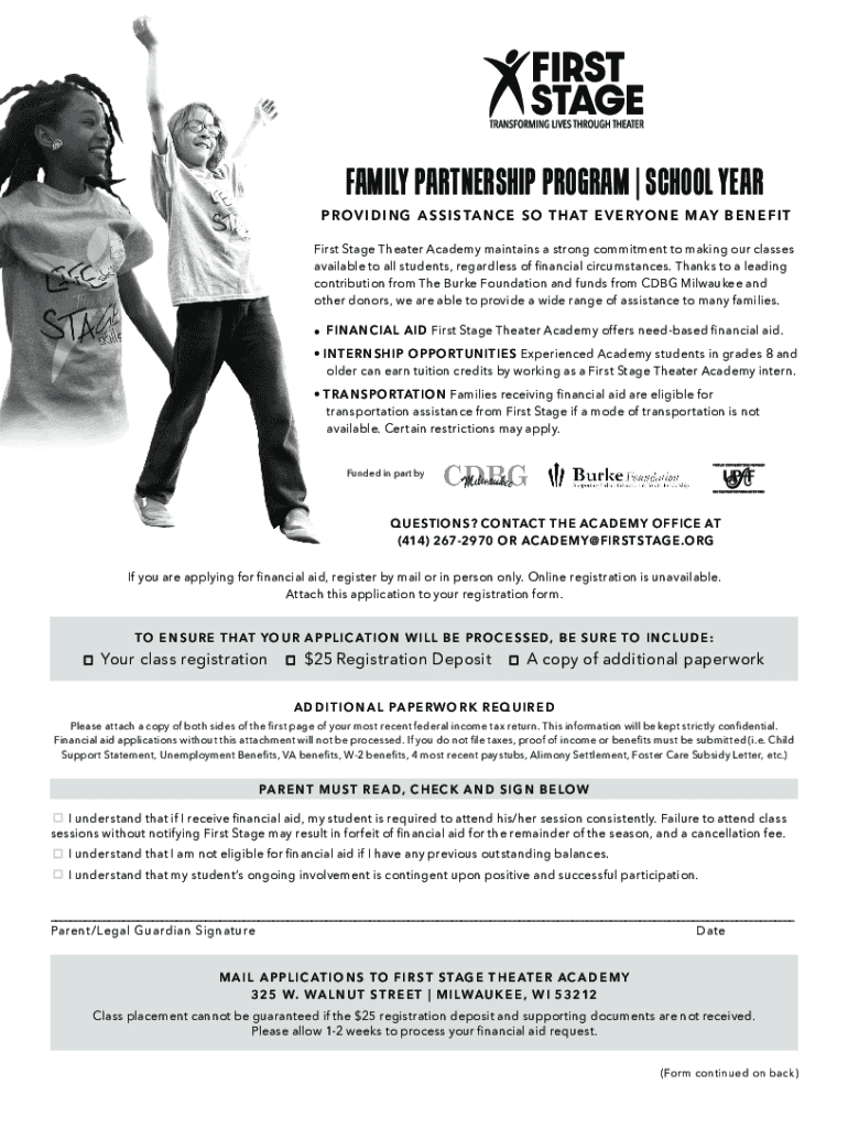 FAMILY PARTNERSHIP PROGRAM SCHOOL YEAR PR OF I D I N G A S S I S TA N C E S O T H AT E V E RIO N E M A B E N E F I T First Stage Theater Academy maintains a strong commitment to making our classes