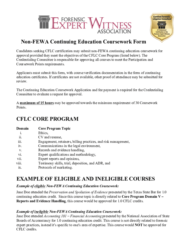 Non-FEWA continuing education coursework refers to education or training that must be completed by individuals who are not members of the Forensic Expert Witness Association (FEWA) to maintain their professional credentials or licenses.