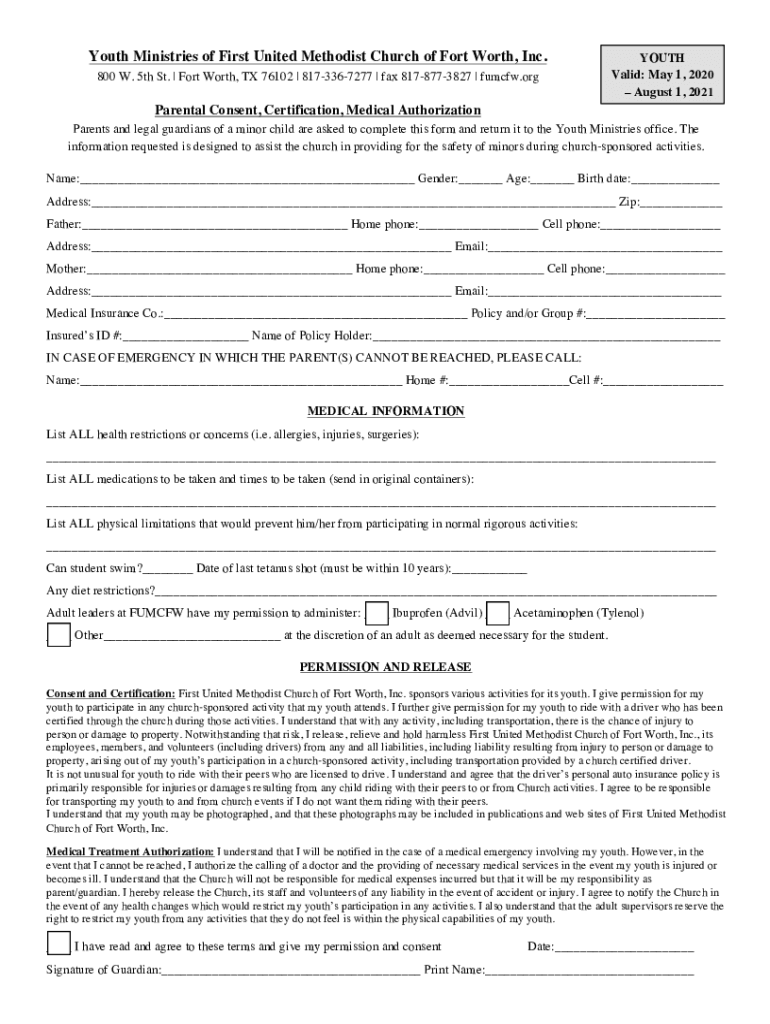 Youth Ministries of First United Methodist Church of Fort Worth, Inc. 800 W. 5th St. Fort Worth, TX 76102 8173367277 faxes 8178773827 fumble. Youth Valid: May 1, 2020, August 1, 2021! Parental Consent,