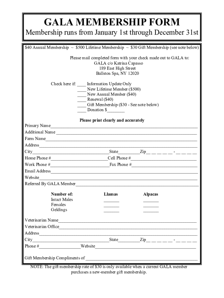 GALA MEMBERSHIP FORMMembership runs from January 1st through December 31st $40 Annual Membership $500 Lifetime Membership $30 Gift Membership (see note below) Please mail completed form with your