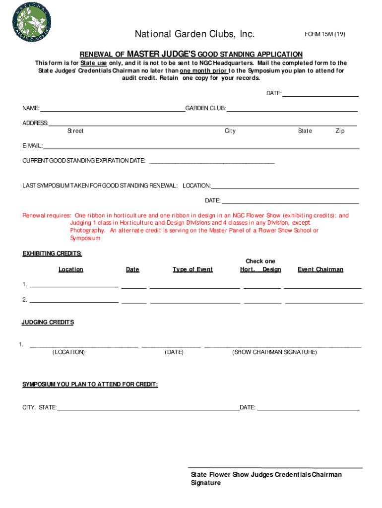 National Garden Clubs, Inc. FORM 15M (19)RENEWAL OF MASTER JUDGE IS GOOD STANDING Applications form is for State use only, and it is not to be sent to NGC Headquarters. Mail the completed form to
