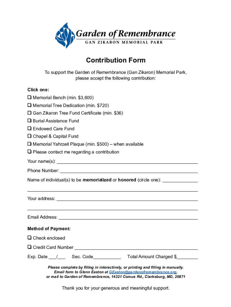 Contribution Form To support the Garden of Remembrance (An Iron) Memorial Park, please accept the following contribution: Click one:o Memorial Bench (min. $3,600) o Memorial Tree Dedication (min.