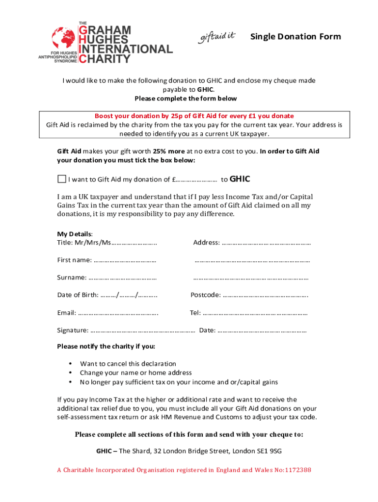 Single Donation Form would like to make the following donation to CHIC and enclose my check made payable to CHIC. Please complete the form blowiest your donation by 25p of Gift Aid for every 1 you donateGift Aid is reclaimed by the charity from the tax you pay for the current tax year. Your address is