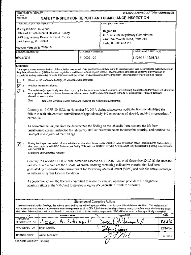 NRC FORM 591M PART 1U. S. NUCLEAR REGULATORY COMMISSION(072012)SAFETY INSPECTION REPORT AND COMPLIANCE INSPECTION1ocFR2.2o12. NRG/REGIONAL OFFICE1. LICENSEE/LOCATION INSPECTED Michigan State University