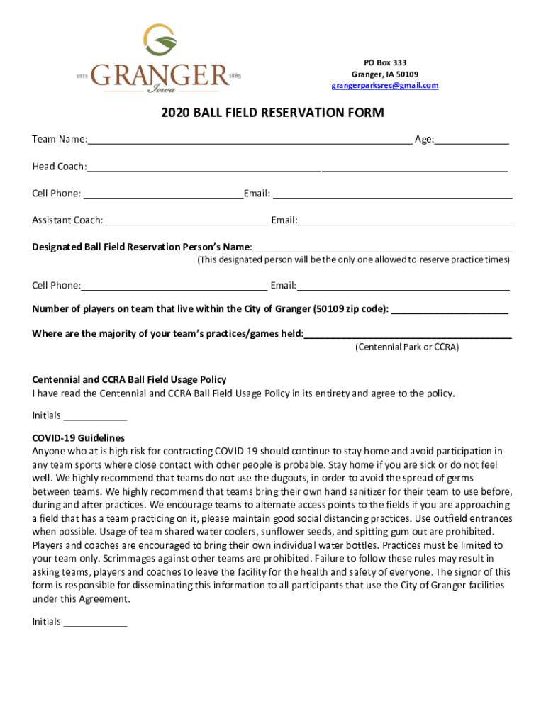 Get the free 2020 BALL FIELD RESERVATION FORM - City of Granger