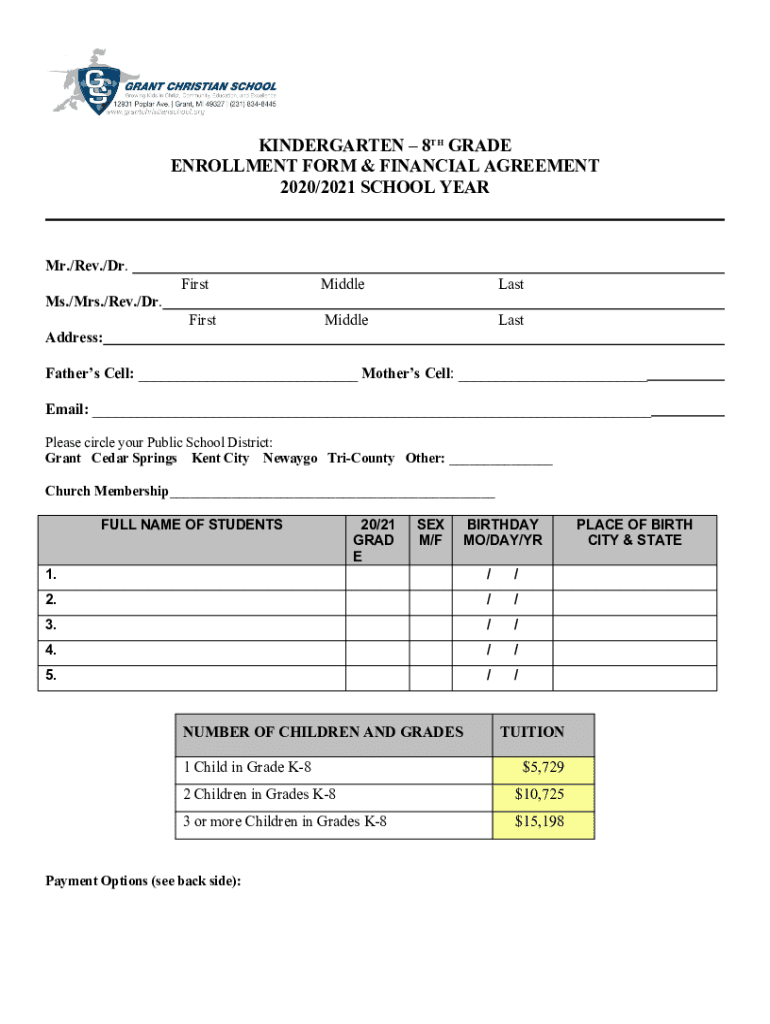KINDERGARTEN 8TH GRADE ENROLLMENT FORM & FINANCIAL AGREEMENT 2020/2021 SCHOOL YEAR Mr./Rev./Dr. FirstMiddleLastMiddleLastMs./Mrs./Rev./Dr. First Address: Fathers Cell: Mothers Cell: Email: Please