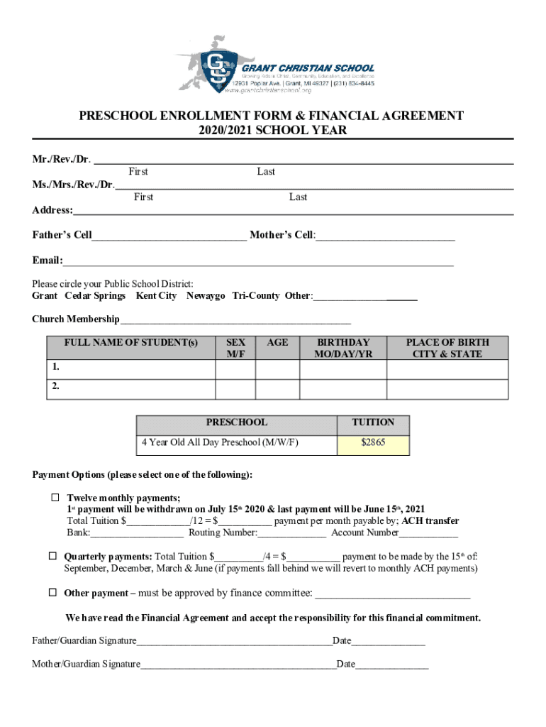 PRESCHOOL ENROLLMENT FORM & FINANCIAL AGREEMENT 2020/2021 SCHOOL YEAR Mr./Rev./Dr. FirstLastMs./Mrs./Rev./Dr. FirstLastAddress: Fathers Cell Mothers Cell: Email: Please circle your Public School District: