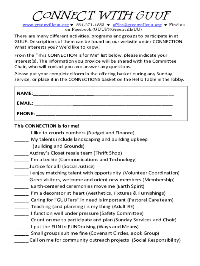CONNECT WITH Guffaws.Greenville.org 8642714883 office Greenville.org Find us on Facebook (GULF Greenville)There are many activities, programs and groups to participate in at GULF. Descriptions of