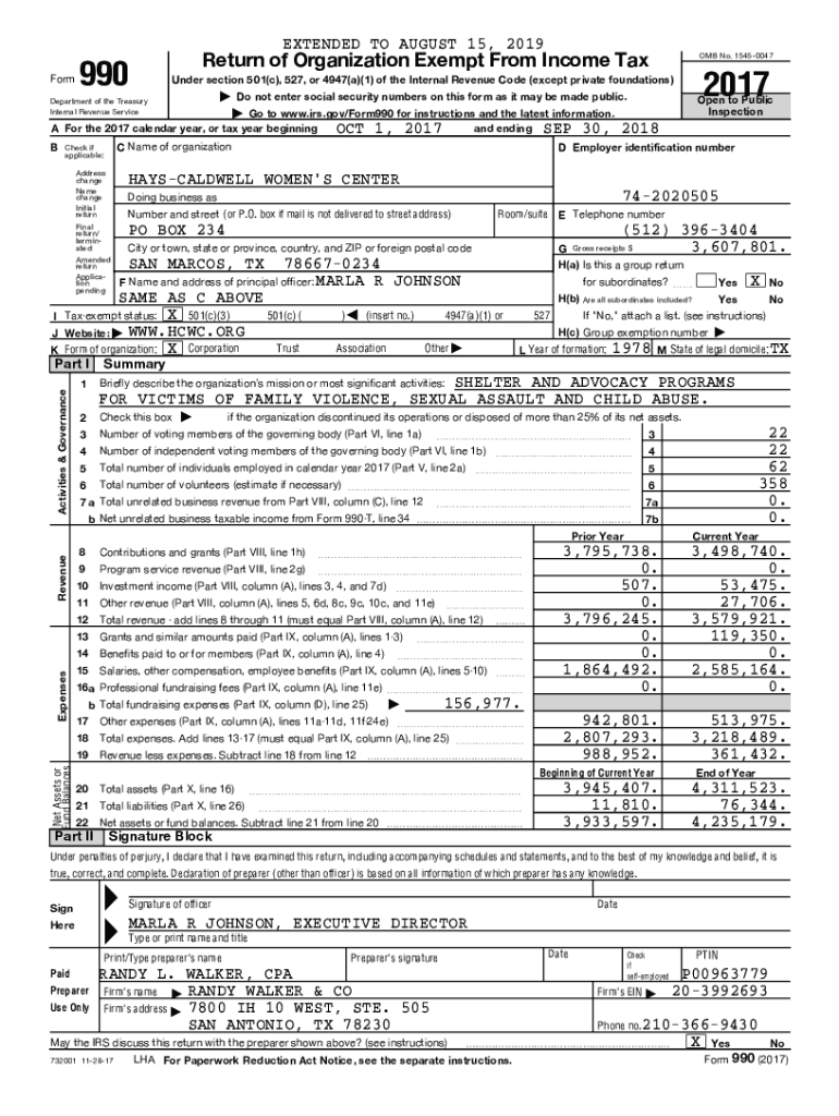 EXTENDED TO AUGUST 15, 2019 Form990Return of Organization Exempt From Income Tax OMB No. 15450047 Do not enter social security numbers on this form as it may be made public. Open to Public Inspection