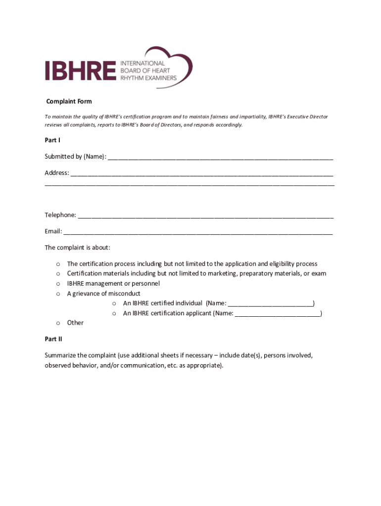 Complaint Form To maintain the quality of Bores certification program and to maintain fairness and impartiality, Bores Executive Director reviews all complaints, reports to Bores Board of Directors,