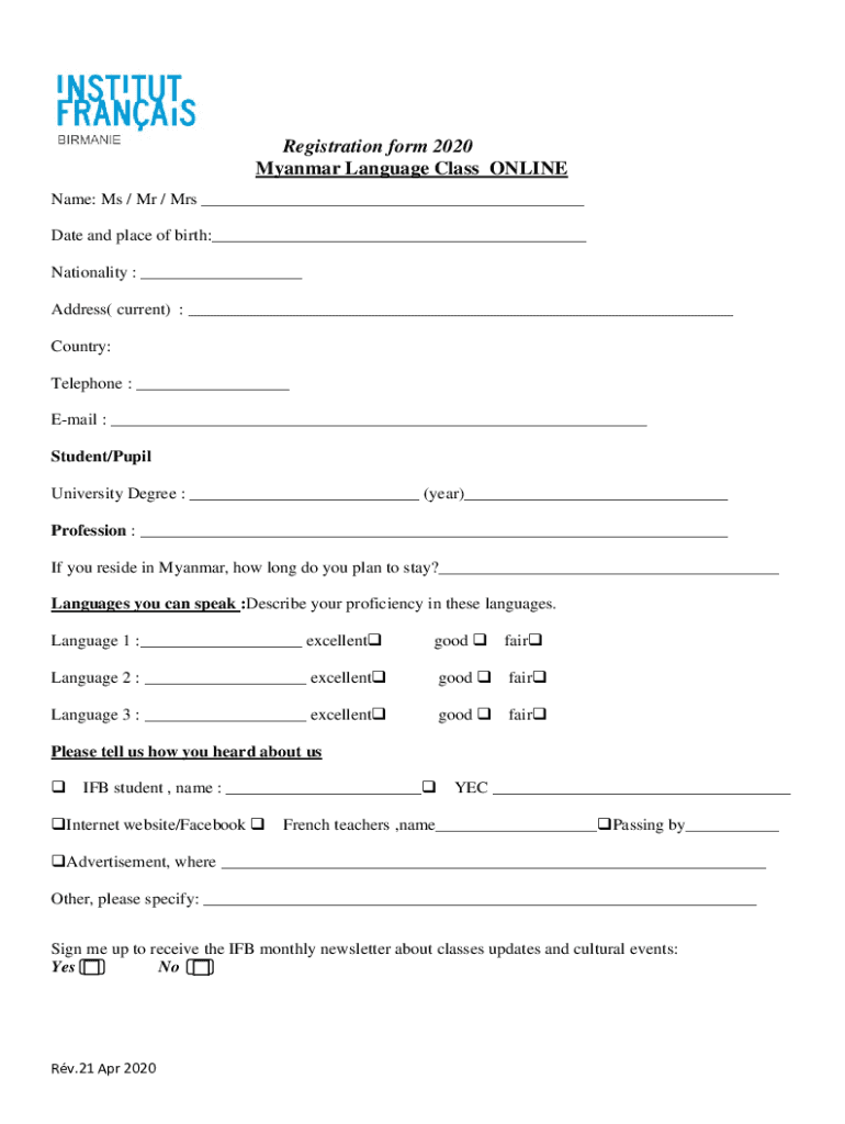 Registration form 2020 Myanmar Language Class ONLINE Name: Ms / Mr / Mrs Date and place of birth: Nationality : Address(current) : Country: Telephone : Email : Student/Pupil University Degree : (year)