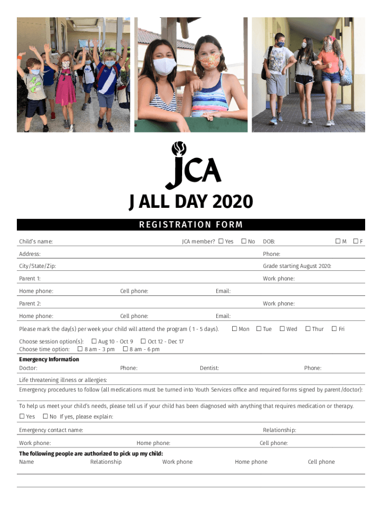J ALL DAY 2020 R E G I ST R AT I O N FO R M Child's name:JCA member? Yes NoDoz:Address:Phone:City/State/Zip:Grade starting August 2020:Parent 1:Work phone:Home phone:Cell phone:Email:Parent 2:Work