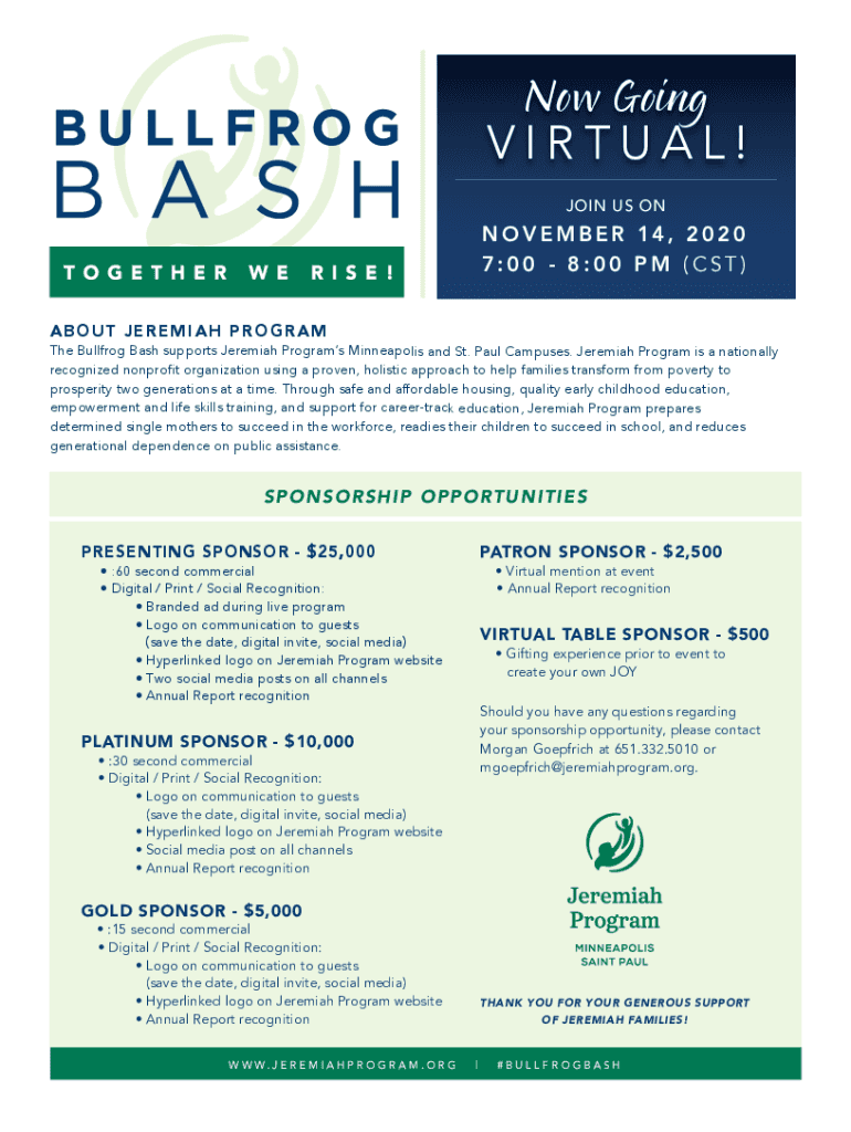 Now GoingVIRTUAL! JOIN US NOVEMBER 14, 2020 7:00 8:00 PM (CST) ABOUT JEREMIAH PROGRAM The Bullfrog Bash supports Jeremiah Programs Minneapolis and St. Paul Campuses. Jeremiah Program is a nationally