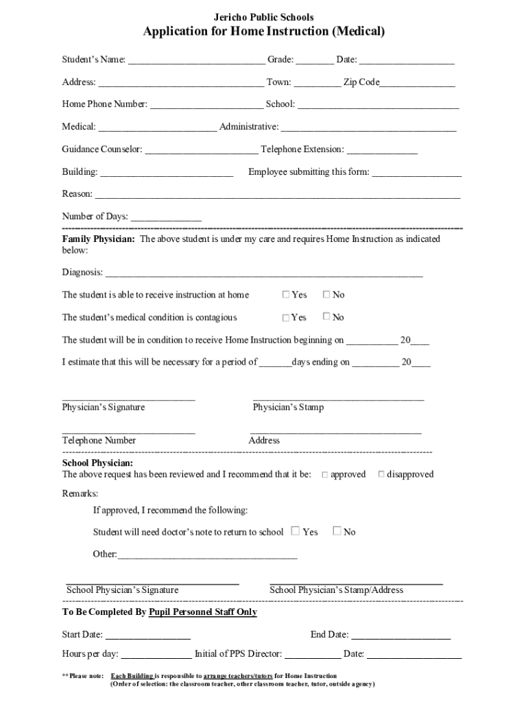 Jericho Public SchoolsApplication for Home Instruction (Medical) Students Name: Grade: Date: Address: Town: Zip Code Home Phone Number: School: Medical: Administrative: Guidance Counselor: Telephone