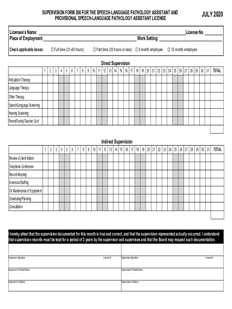 SUPERVISION FORM 200 FOR THE SPEECHLANGUAGE PATHOLOGY ASSISTANT AND PROVISIONAL SPEECHLANGUAGE PATHOLOGY ASSISTANT LICENSEJULY 2020Licensees Name: License No. Place of Employment: Work Setting: Check