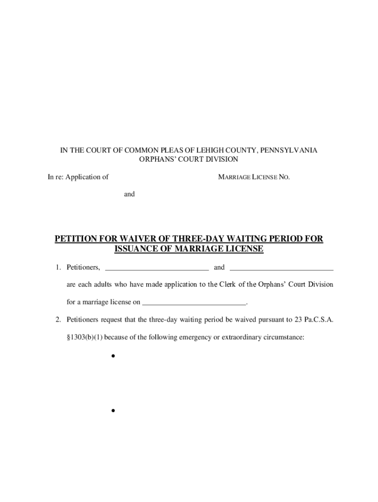 IN THE COURT OF COMMON PLEAS OF LEHIGH COUNTY, PENNSYLVANIA ORPHANS COURT DIVISION In re: Application marriage LICENSE NO. competition FOR WAIVER OF THREADY WAITING PERIOD FOR ISSUANCE OF MARRIAGE