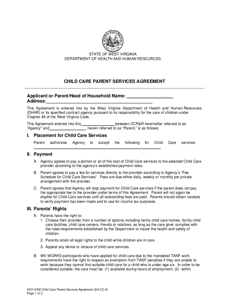 STATE OF WEST VIRGINIA DEPARTMENT OF HEALTH AND HUMAN RESOURCESCHILD CARE PARENT SERVICES AGREEMENT Applicant or Parent/Head of Household Name: Address: This Agreement is entered into by the West