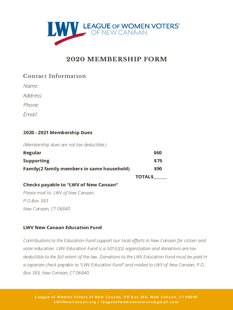 2020 MEMBERSHIP FORM ContactInformationName: Address: Phone: Email: 2020 2021 Membership Dues (Membership dues are not tax-deductible.) Regular$60Supporting$75Family(2 family members in same household)$90