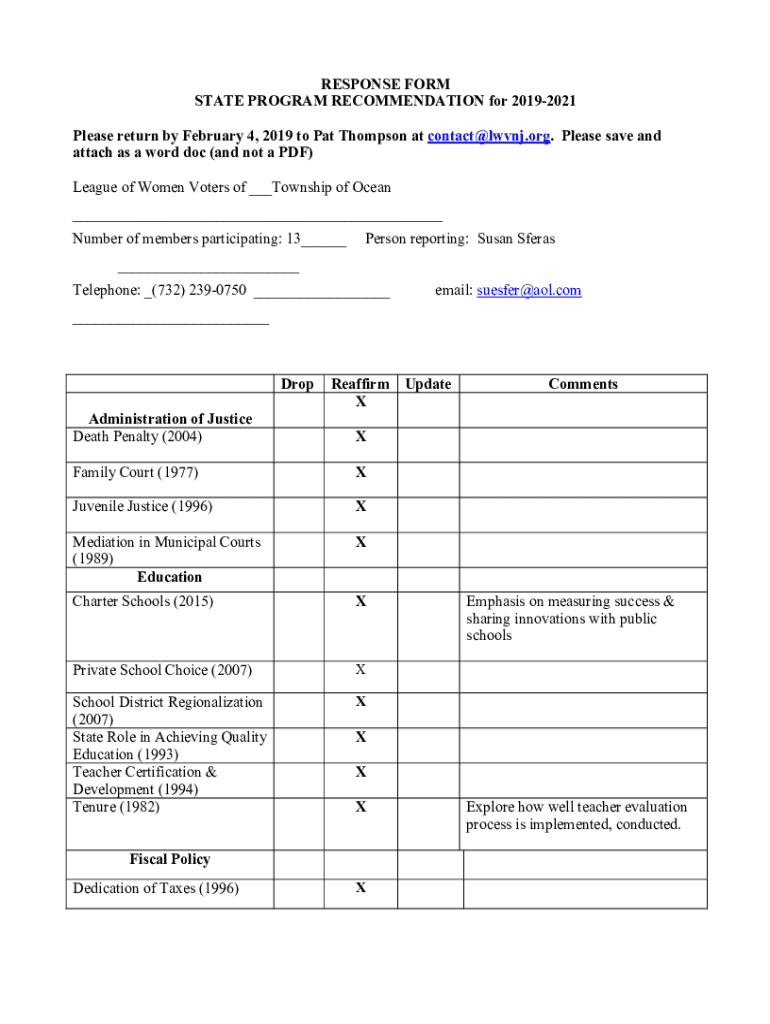 RESPONSE FORM STATE PROGRAM RECOMMENDATION for 20192021 Please return by February 4, 2019, to Pat Thompson at contact LVN.org. Please save and attach as a Word doc (and not a PDF) League of Women