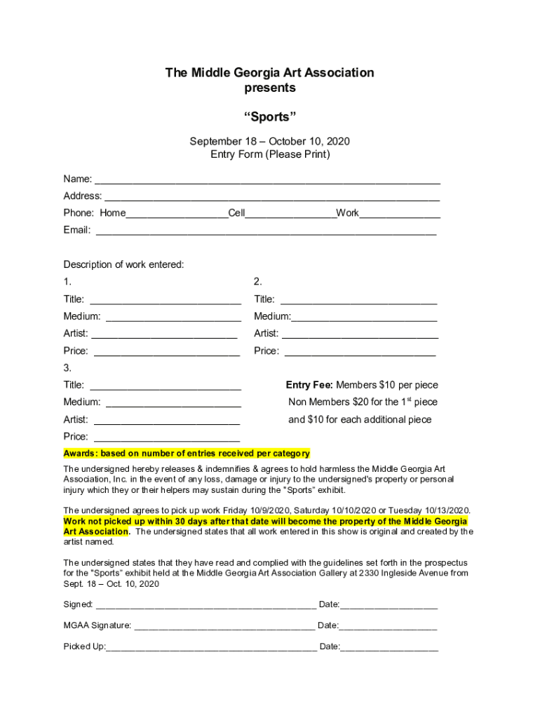 The Middle Georgia Art Association presents Sports September 18 October 10, 2020, Entry Form (Please Print) Name: Address: Phone: Home Cell Work Email: Description of work entered: 1.2. Title: Title: