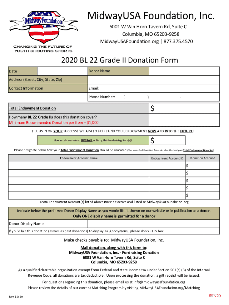 Get the free 20 BL 22 Grade II Donation Form - MidwayUSA Foundation