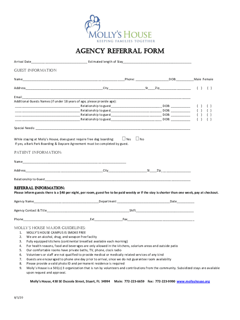 Agency Referral Form Arrival Date Estimated length of Stay Guest Information Name Phone: DOB: Male Female Address City St Zip Email Additional Guests Names (if under 18 years of age, please provide