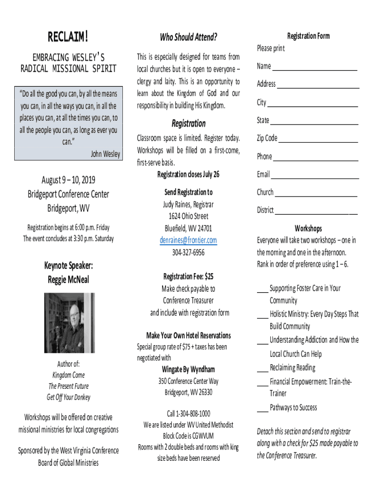 RECLAIM! Who Should Attend?EMBRACING WESLEY RADICAL MISSION AL Spirits is especially designed for teams from local churches, but it is open to everyone clergy and laity. This is an opportunity to