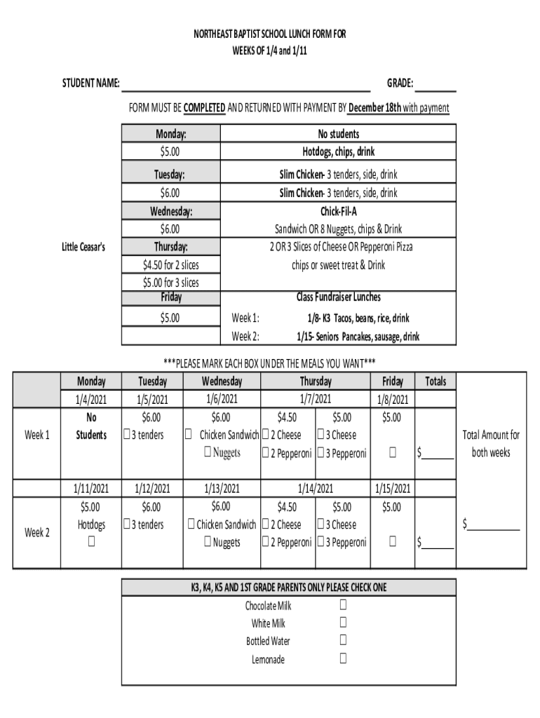 NORTHEAST BAPTIST SCHOOL LUNCH FORM FOR