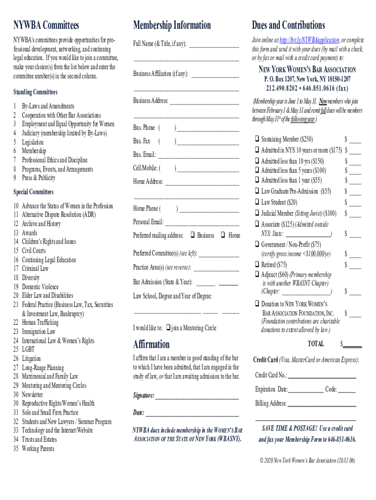 NY WBA CommitteesMembership InformationDues and ContributionsNYWBA's committees provide opportunities for professional development, networking, and continuing legal education. If you would like to