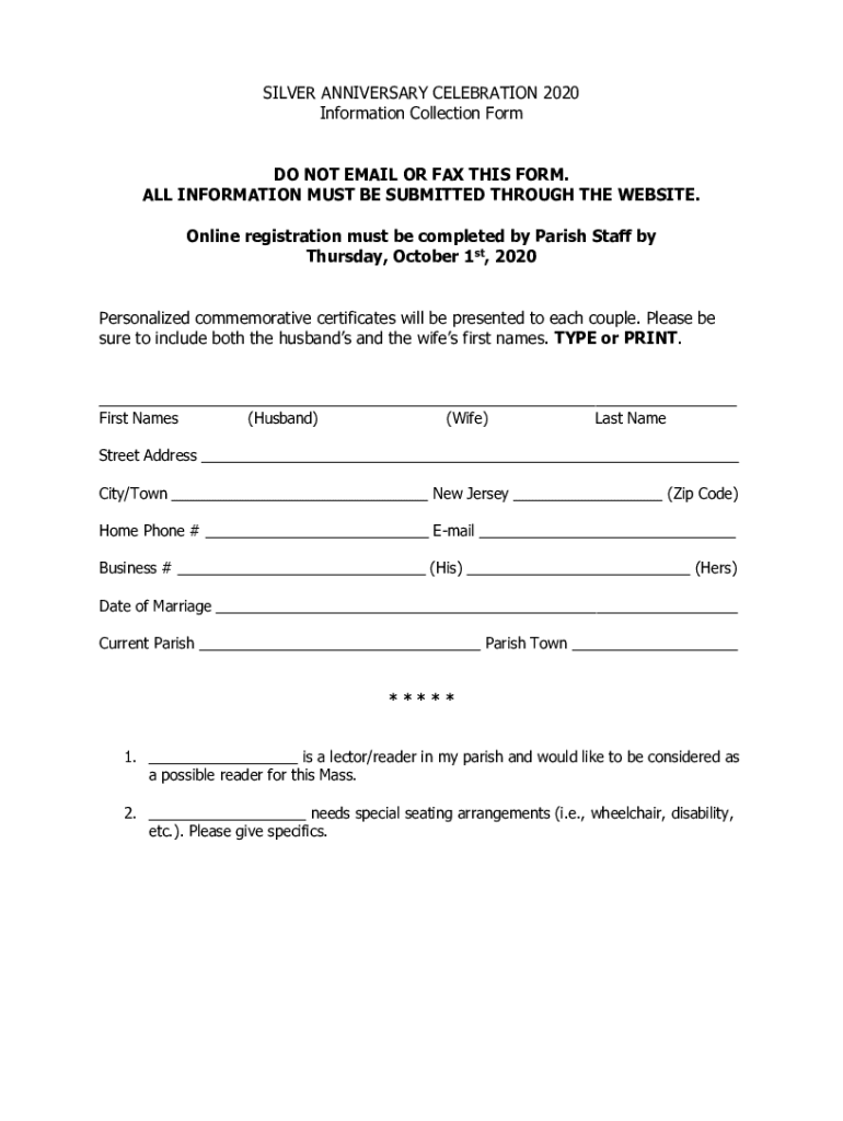 SILVER ANNIVERSARY CELEBRATION 2020 Information Collection Form DO NOT EMAIL OR FAX THIS FORM. ALL INFORMATION MUST BE SUBMITTED THROUGH THE WEBSITE. Online registration must be completed by Parish