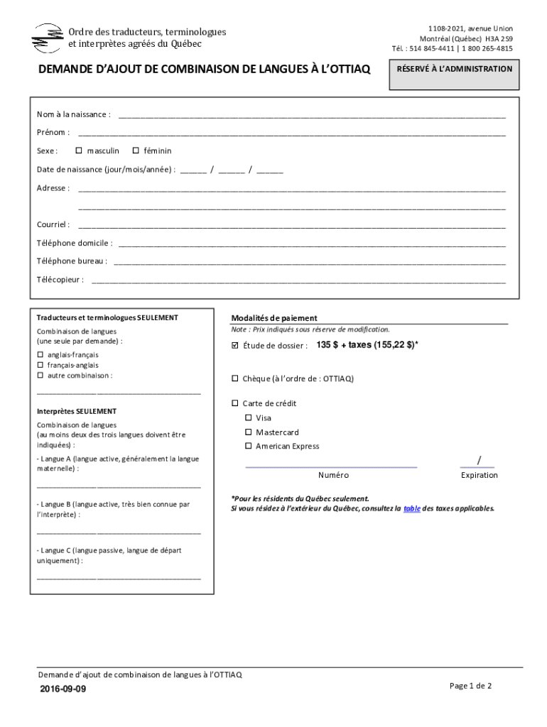 11082021, avenue Union Montreal (Quebec) H3A 2S9 Tl. 514 8454411 1 800 2654815Ordre DES traducers, terminologies ET interprets ages Du QubecDEMANDE ABOUT DE COMBINATION DE LANGUAGES LOTTIAQRSERV