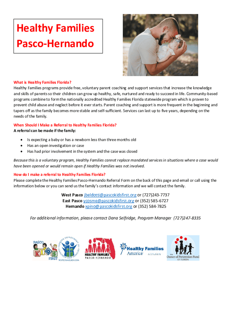Healthy Families programs provide free, voluntary parent coaching and support services that increase the knowledge