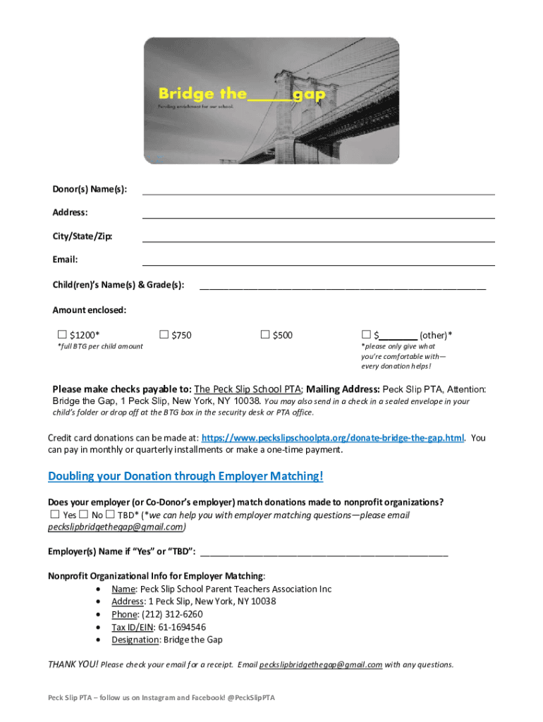 Donor(s)Name(s):Address:City/State/Zip:Email: Child(men)name(s)grade(s): Amount enclosed: $1200*$$750500×fullBTGperchildamount $ (other)* *pleaseonlygivewhat yourecomfortablewith everydonationhelps!