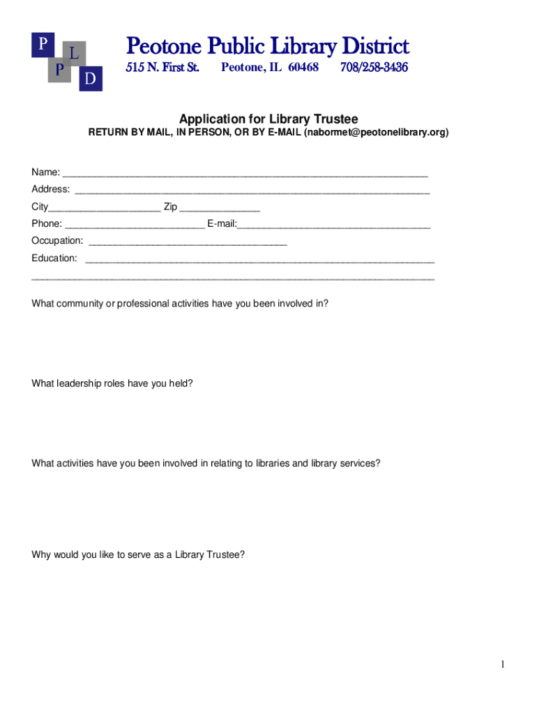Photon Public Library District 515 N. First St. Photon, IL 60468708/2583436Application for Library Trustee RETURN BY MAIL, IN PERSON, OR BY EMAIL (aborted peotonelibrary.org)Name: Address: City Zip