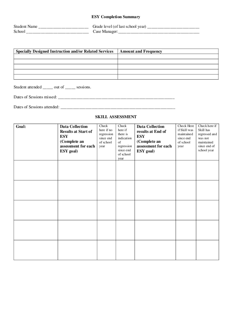 ESY Completion Summary Student Name Grade level (of last school year) School Case Manager: Specially Designed Instruction and/or Related ServicesAmount and FrequencyStudent attended out of sessions.